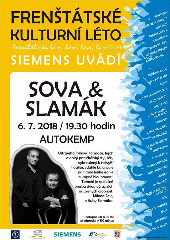 Ostravská folková formace úspěšně navazující na to nejlepší, co v oblasti písničkářství přinesla česká folková scéna poslední čtvrtiny minulého století. Jejich osobitý písničkářský styl, léty vybroušený k nejvyšší kvalitě, je charakteristický chytlavými melodiemi a chytře vypointovanými texty zdařile balancujícími na hraně lehké ironie a vtipné hloubavosti. Taková je společná tvorba dvou výrazných autorských osobností Milana Sovy a Kuby Slamáka. Předprodej vstupenek v TIC města. Vstupné 60 Kč dospělí, 30 Kč děti.