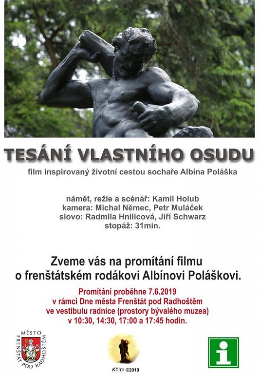 V průběhu programu Dne města Frenštát pod Radhoštěm a Dne sociálních služeb vás zveme na promítání filmu Tesání vlastního osudu. Film inspirovaný životem sochaře Albína Poláška natočil frenštátský rodák Kamil Holub. Těšit se můžete na vzpomínky neteře slavného sochaře paní Radmily Hnilicové. Promítat se bude ve vestibulu radnice v 10:30, 14:30, 17:00 a 17:45 hodin.