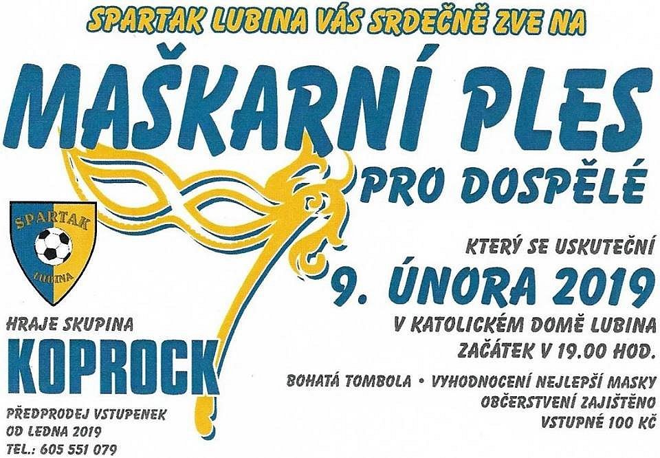 Lubina 9. 2. 2019 od 19:00 MAŠKARNÍ PLES PRO DOSPĚLÉ