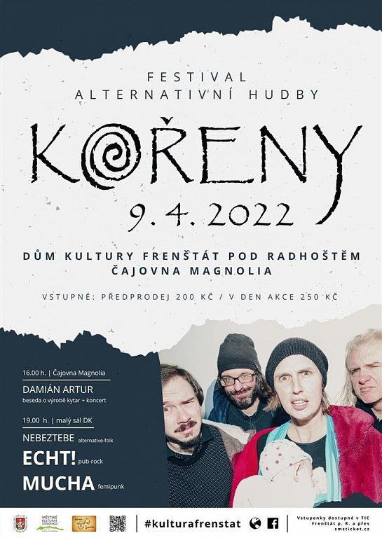 Po roční odmlce se fanoušci alternativní muziky mohou opět těšit na indoorový festival Kořeny. Letos proběhne 9. dubna, tradičně v prostorách DK Frenštát. V útulných prostorách čajovny Magnolia nejprve proběhne setkání s písničkářem Damiánem Arturem, který nejenže zahraje své křehké autorské písně, ale také popovídá o tom, jak si sám vyrábí akustické kytary. V malém sále DK pak vystoupí Nebeztebe, Echt! a Mucha. Nebeztebe jsou progresivní folkaři z Brna, kteří svou poetickou hudbu umocňují zvukovými efekty a projekcemi. Enfant terrible pražského pub-rocku Echt! na české scéně působí přes 30 let. V jejím čele stojí Karel Malík, kterého můžete znát jako saxofonistu legendární Hudby Praha. Nikola Mucha přijede se svou kapelou a nasolí do vás pořádnou porci feministického punku. Zapleteme se navzájem do kořenů hudby a bude to intenzivní, pohodový večer.