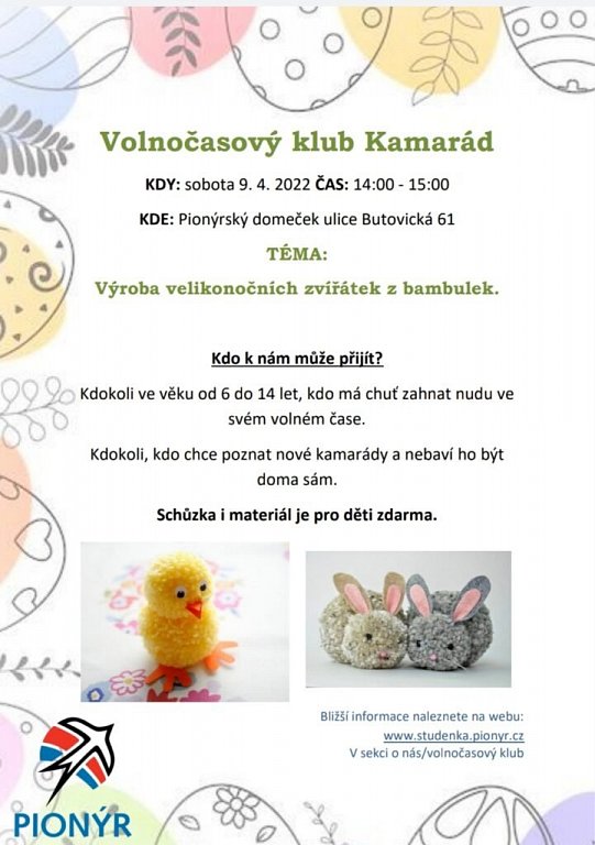 Výroba velikonočních zvířátek z bambulek pro děti od 6 do 14 let, které chtějí zahnat nudu a poznat nové kamarády. Schůzka i materiál je zdarma.