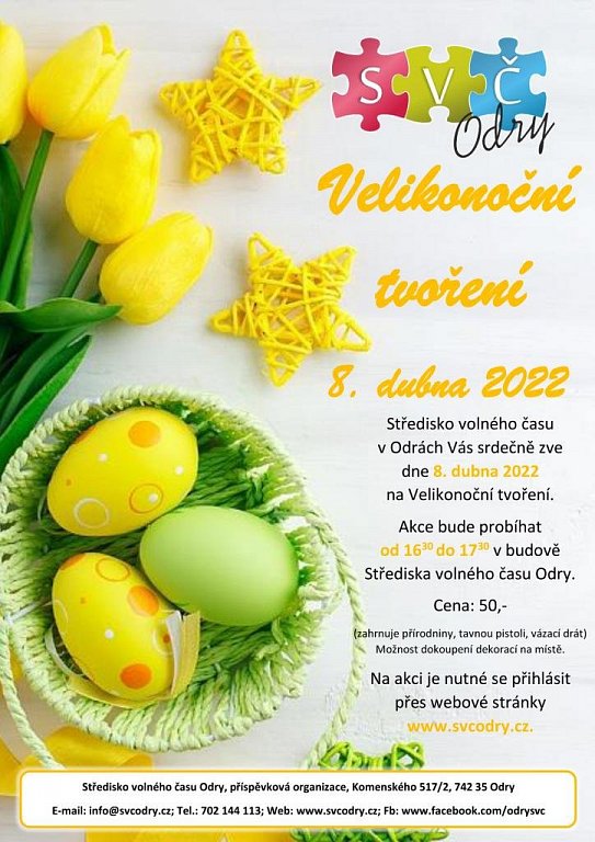 Středisko volného času Odry Vás zve na Velikonoční tvoření. Na akci je nutné se přihlásit přes www.svcodry.cz.
