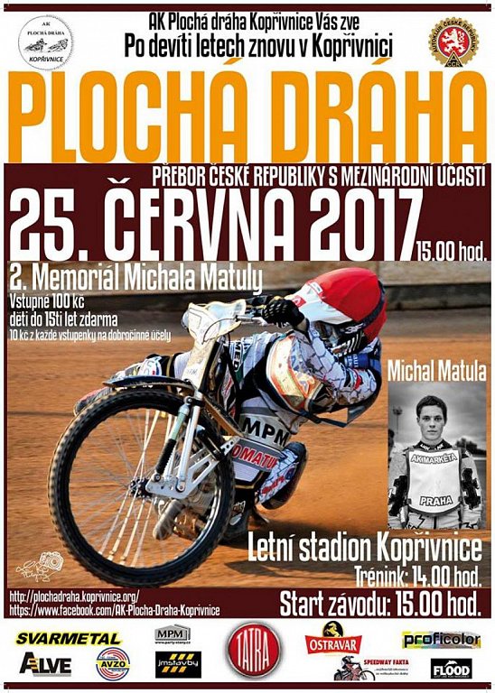 AK Plochá dráha Kopřivnice zve všechny na PŘEBOR ČESKÉ REPUBLIKY S MEZINÁRODNÍ ÚČASTÍ + 2.MEMORIÁL MICHALA MATULY. Přebor ČR na start přivede nejen české závodníky, ale i jezdce z ciziny.