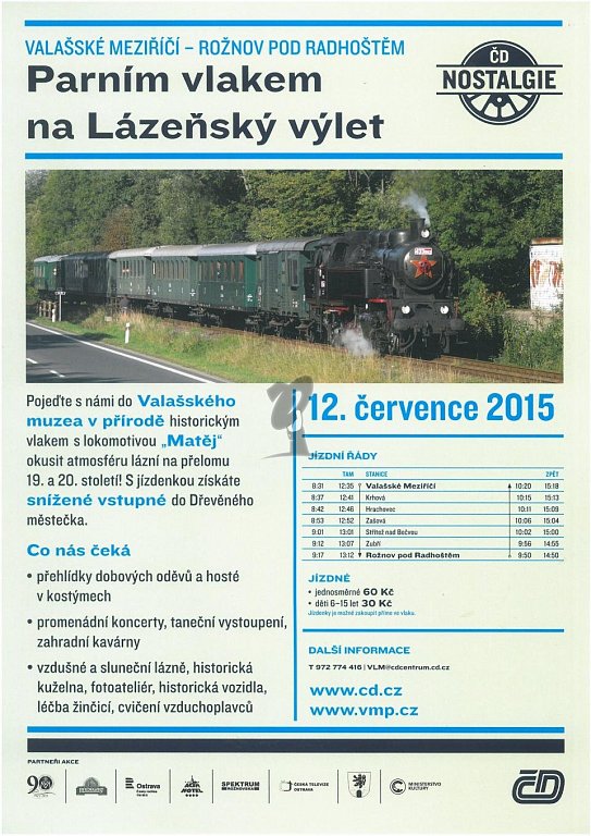Lázeňský výlet 2015 je návrat do časů lázeňského Rožnova. Návštěvníci se budou moci vrátit do časů, kdy byl Rožnov vyhlášen lázeňským místem. Devátá hodina ranní otevře brány muzea a lázeňští hosté v dobových kostýmech zahájí svou ranní procházku na čerstvém vzduchu za zvuků hudby…