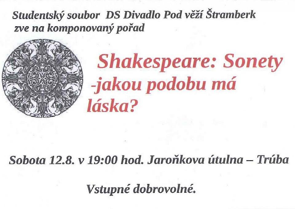 Štramberk 12. 8. 2017 od 19:00 SHAKESPEARE: SONETY – JAKOU PODOBU MÁ LÁSKA?