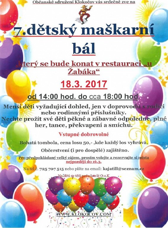 Občanské sdružení Klokočov zve všechny na pěkné a zábavné odpoledne plné her, tance, překvapení a smíchu. Připravena bude bohaté občerstvení a tombola, kde každý los vyhrává. Cena losu 50 Kč.
