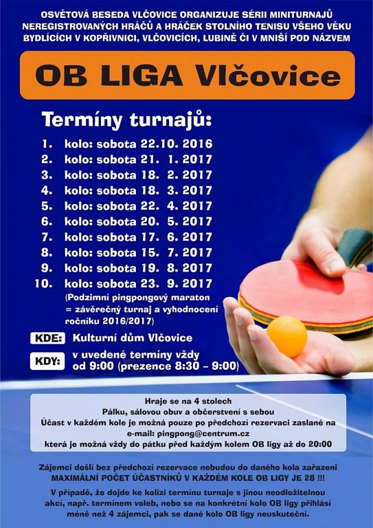 Nultý ročník série miniturnajů ve stolním tenise pro neregistrované amatérské hráče a hráčky z Kopřivnice, Vlčovic, Lubiny a Mniší pořádaný Osvětovou besedou Vlčovice.