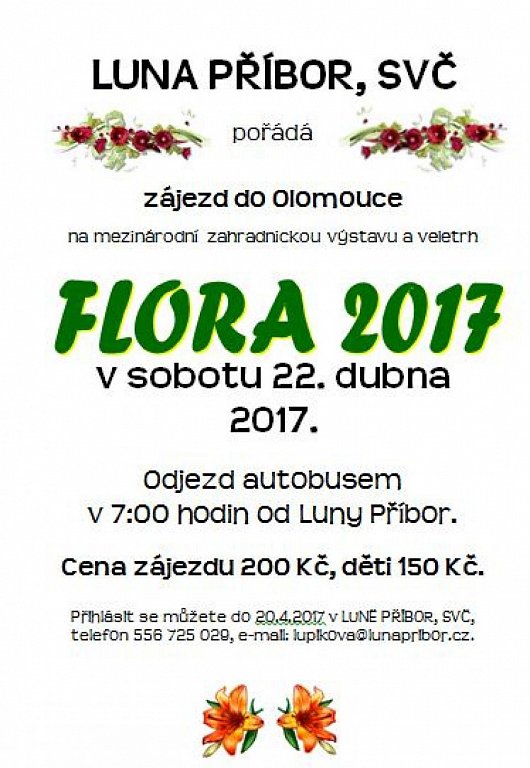 Středisko volného času Luna Příbor pořádá zájezd do Olomouce na mezinárodní zahradnickou výstavu a veletrh.