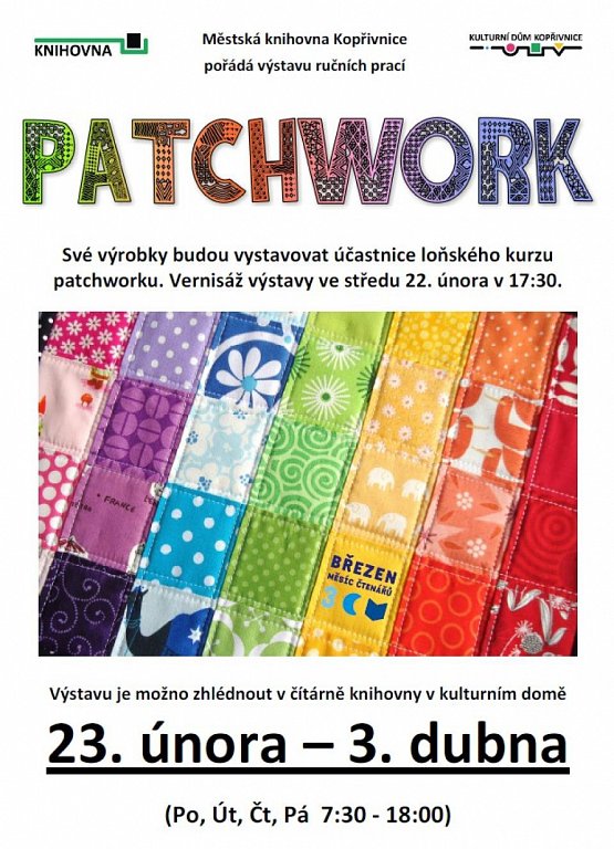 Městská knihovna Kopřivnice pořádá výstavu ručních prací „Patchwork“. Své výrobky budou vystavovat účastnice loňského kurzu patchwork.