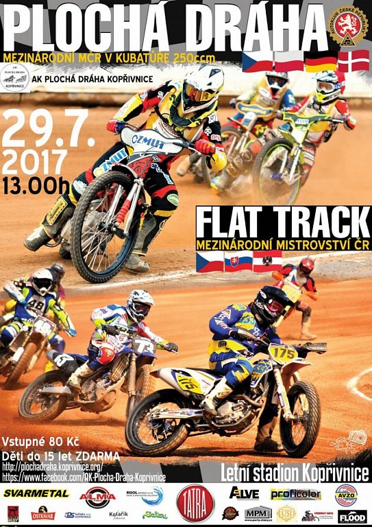 AK Plochá dráha Kopřivnice zve všechny na mezinárodní mistrovství ČR v kubatůře a "americkou plochou dráhu" Flat track. Letos podruhé zahřmí na našem ovále plochodrážní, ale i flat trackové stroje. Čeká nás pořádná porce ploché dráhy. V jeden den budete moc spatřit hned dva závody. V první řadě to bude klasický plochodrážní závod v kubatuře 250 ccm. Druhý závodem bude rovněž nesmírně zajímavý Flat Track. Odvětví ploché dráhy, které nese někdy i podtitul Americká Plochá dráha.