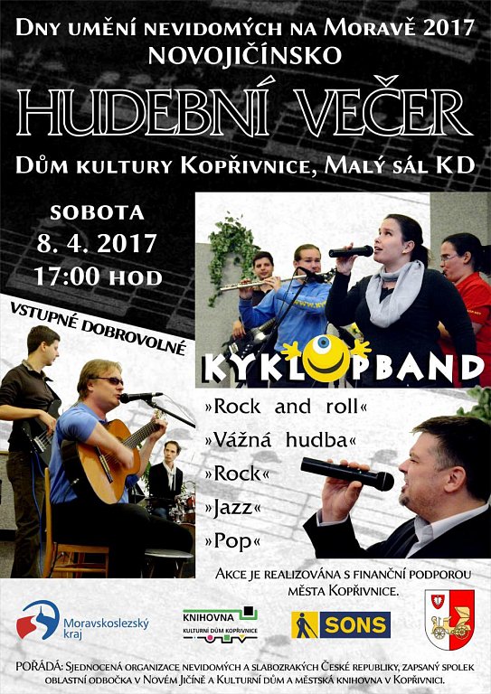 Hudební večer v rámci Dnů umění nevidomých na Moravě 2017 pořádaných Sjednocenou organizací nevidomých a slabozrakých ČR, oblastní odbočkou Nový Jičín, Kulturním domem Kopřivnice a Městskou knihovnou Kopřivnice. Vystoupí Kyklopband.