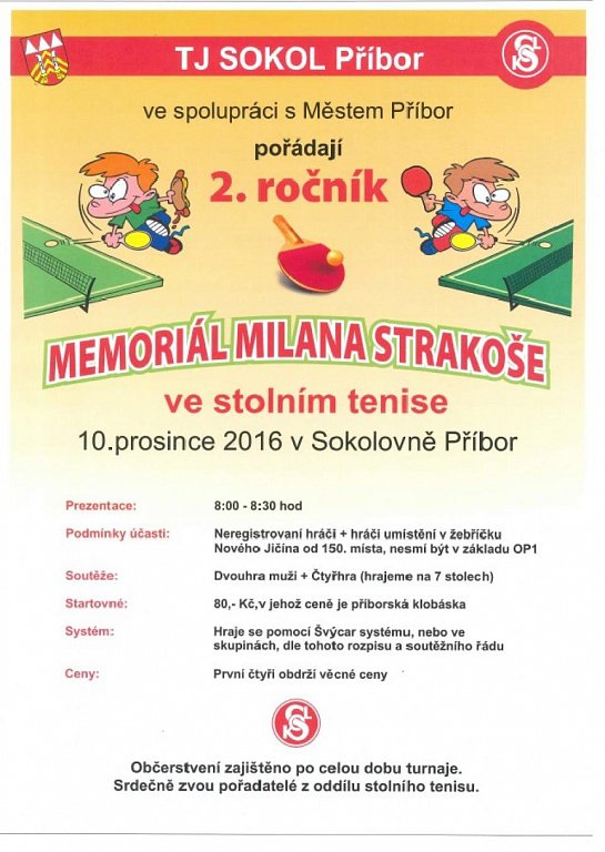 TJ Sokol Příbor a město Příbor zvou všechny na 2. ročník Memoriálu Milana Strakoše ve stolním tenise. Hraje se pomocí Švýcar systému, nebo ve skupinách, dle tohoto rozpisu a soutěžního řádu. Občerstvení zajištěno po celou dobu turnaje.