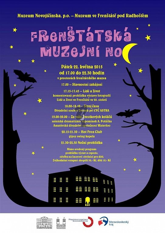 Vystoupí: děti z divadelního souboru Zvonek z Centra volného času ASTRA, Amatérská divadelní společnost Waterloo a skupina Hot Fren Club. V průběhu celého programu: prohlídka stálých expozic, střelba na laserové střelnici, výstava fotografií Lidé a život ve Frenštátě ve 20. století. Na závěr noční prohlídka muzea Za valašskými strašidly a bájnými bytostmi..