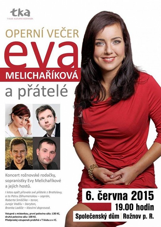 Koncert rožnovské rodačky, sopranistky Evy Melichaříkové a jejích hostů. Již potřetí ve svém rodném městě vystoupí sopranistka Eva Melichaříková. I letos opět přizvala ke spolupráci své přátele z Bratislavy, a to Petru Záhumenskou - soprán, Roberta Smiščíka - tenor, Juraje Vodilu- baryton, Branka Ladiče - klavírní doprovod. Ponořte se s námi do světa nejznámějších českých i světových operních a operetních árií a duetů. Večerem nás provede Jan Kučera a Vilém Melichařík.