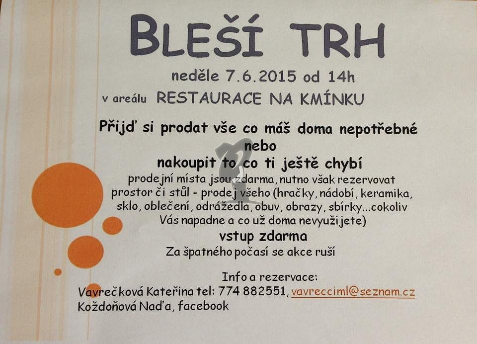 Přijď si prodat vše, co máš doma nepotřebné nebo nakoupit to, co ti ještě chybí. Prodejní místa jsou zdarma, nutno však rezervovat prostor či stůl - prodej všeho (hračky, nádobí, keramika, sklo, oblečení, odrážedla, obuv, obrazy, sbírky... cokoliv Vás napadne a co už doma nevyužijete). Info a rezervace: Vavrečková Kateřina, tel.: 774 882 551, vavrecciml@seznam.cz, Koždoňová Naďa, Facebook