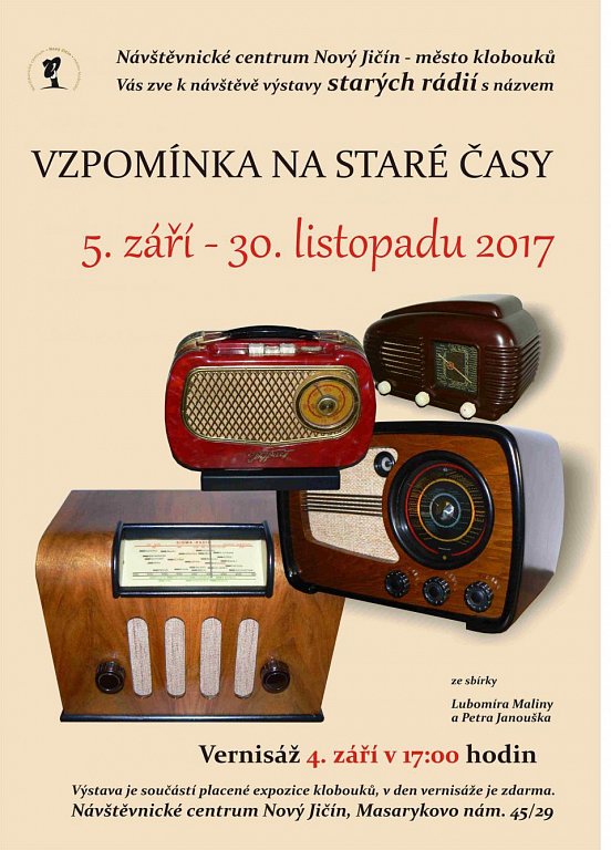 Návštěvnické centrum Nový Jičín - město klobouků si Vás dovoluje pozvat na výstavu starých rádií s názvem VZPOMÍNKA NA STARÉ ČASY ze sbírky Lubomíra Maliny a Petra Janouška.