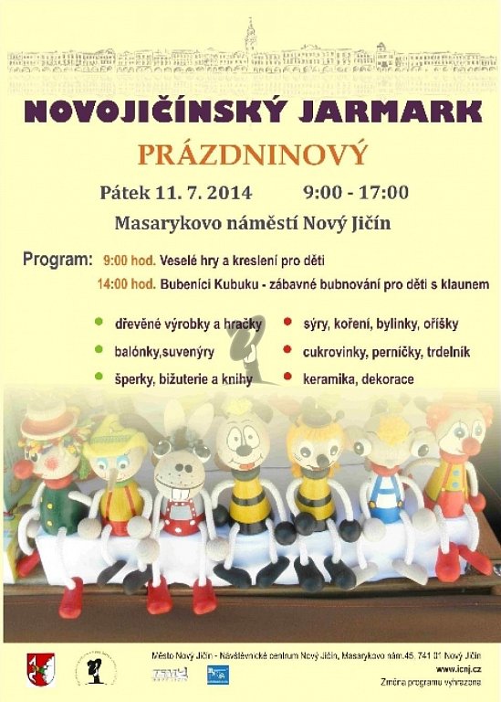 V pátek dne 11.července proběhne na Masarykově náměstí v Novém Jičíně další Novojičínský jarmark. Tentokrát "Prázdninový", kde bude možnost zakoupit cukrovinky, perníčky, trdelník, balónky a suvenýry z keramiky, dřeva, bižuterie, šperky a spoustu dalších Věcí. V rámci akce vystoupí od 14:00 hod. bubeníci KUBUKU - Zábavné bubnování s klaunem.
