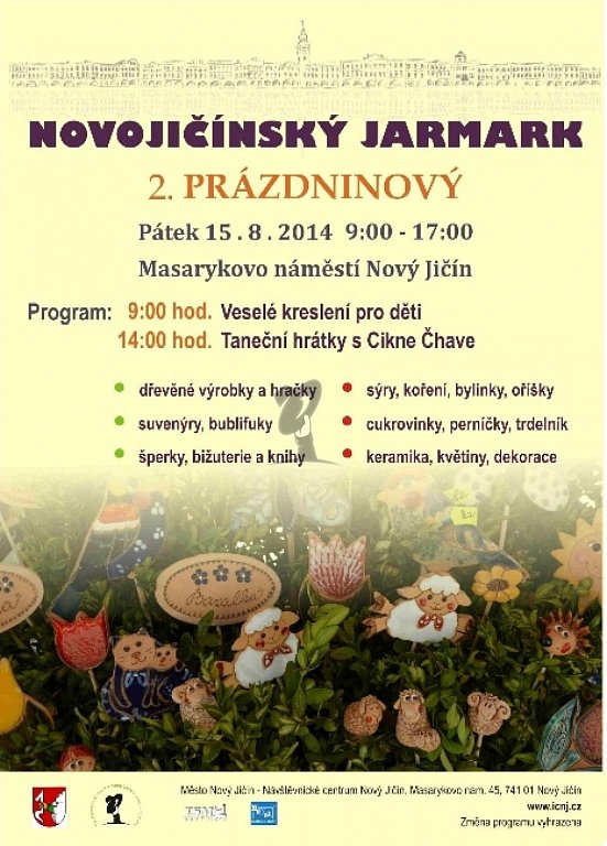 V pátek dne 15. srpna proběhne na Masarykově náměstí v Novém Jičíně další Novojičínský jarmark s doprovodným programem. Tentokrát "2. prázdninový", kde bude možnost zakoupit cukrovinky, perníčky, trdelník, bublifuky a suvenýry z keramiky, dřeva, bižuterie, šperky, knihy, květiny a spoustu dalších věcí.