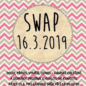 Dojdi, přines, vyměň, odnes. Swap je výměna nových, zachovalých, ale nevhodných kousku dámského oblečení a oděvních doplňků, které vám doma leží a čekají na využití. Na swap věci jednoduše donesete (ale není to podmínkou) a pokud se vám něco zalíbí, věci v jakémkoliv množství si odnesete. Nejde o množství donesených věcí, ale o jejich kvalitu. Malé chutné občerstvení a káva zajištěna, stejně tak dětská hernička.