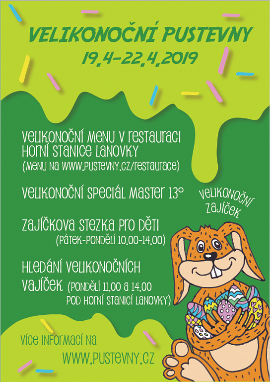 velikonoční menu v restauraci Horní stanice lanovky, zajíčkova stezka pro děti - pátek až pondělí 10:00-14:00 hod., hledání velikonočních vajíček - pondělí 11:00 a 14:00 hod.