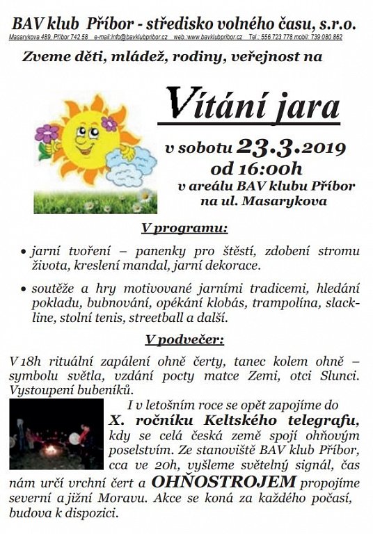 Jarní tvoření - panenky pro štěstí, zdobení stromu života, kreslení mandal, jarní dekorace. Soutěže a hry motivované jarními tradicemi, hledání pokladu, bubnování, opékání klobás, trampolína, slack-line, stolní tenis, streetball a další. V 18 hodin pak rituální zapálení ohně čerty, tanec kolem ohně - symbolu světla, vzdání pocty matce Zemi, otci Slunci. Vystoupení bubeníků. V rámci akce proběhne ve 20 hodin X. ročník Keltského telegrafu, kdy se celá česká země spojí ohňovým poselstvím. Akce se koná za každého počasí, budova k dispozici.