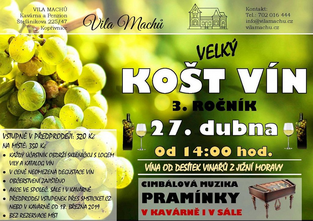Vína od desítek vinařů z jižní Moravy. Cimbálová muzika Pramínky v kavárně i v sále a za pěkného počasí také na zbrusu nové venkovní zahrádce. Každý účastník obdrží skleničku s logem vily a katalog vín. V ceně neomezená degustace vín. Občerstvení zajištěno. Předprodej vstupenek přes smsticket.cz nebo v kavárně od 18. března 2019. Na akci nebude možné si rezervovat místo.
