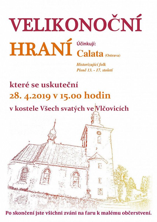 UčinkujeCalata (Ostrava) - historizující folk, písně 13. - 17. století. Po skončení jste všichni zváni na faru k malému občerstvení. Vstupné dobrovolné.