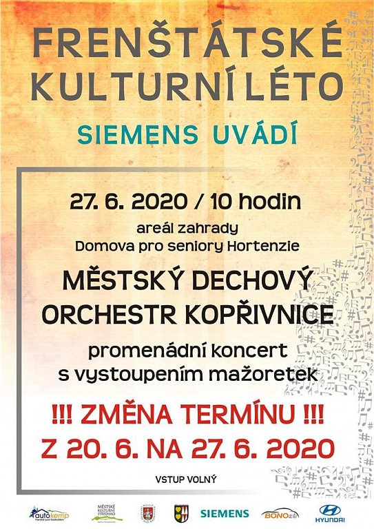 Frenštát pod Radhoštěm 27. 6. 2020 od 10:00 MĚSTSKÝDECHOVÝ ORCHESTR KOPŘIVNICE (PŘELOŽENO Z 20. 6. 2020)