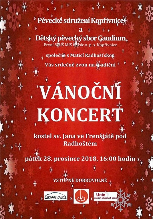 Zve Vás pěvecké sdružení Kopřivnice a Dětský pěvecký sbor Gaudium společně s Maticí Radhošťskou. Vstupné dobrovolné.