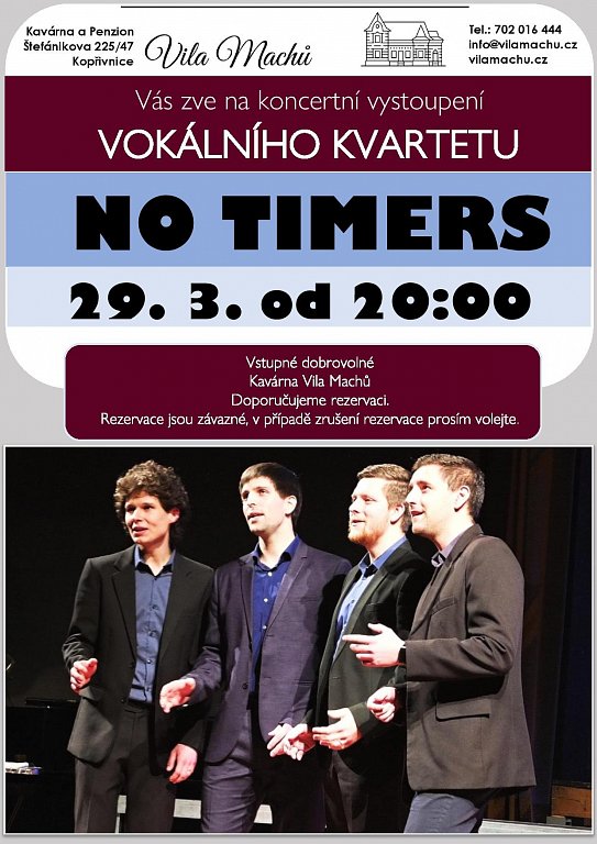 Přijďte si poslechnout tuto čtyřčlennou skupinu, zpívající písně ve specifické barbershop úpravě, která Vám zpříjemní páteční večer v kavárně.