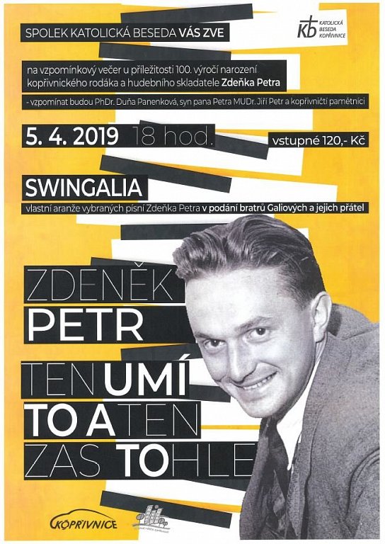 Vzpomínkový večer u příležitosti 100. výročí narození kopřivnického rodáka a hudebního skladatele Zdeňka Petra. Vzpomínat budou PhDr. Duňa Panenková, syn pana Petra MUDr. Jiří Petr a kopřivničtí pamětníci. SWINGALIA - vlastní aranže vybraných písní Zdeňka Petra v podání bratrů Galiových a jejich přátel.