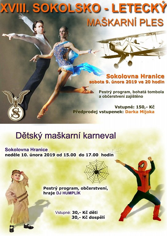 Tradiční Sokolsko-letecký maškarní ples se bude konat v sobotu 9. února od 20:00 hodin v Sokolovně v Hranicích. Těšit se můžete na pestrý program, bohatou tombolu a občerstvení. Vstupné činí 150 Kč. Vstupenky v předprodeji jsou k dostání v Darce – Mijoka na Masarykově náměstí v Hranicích.