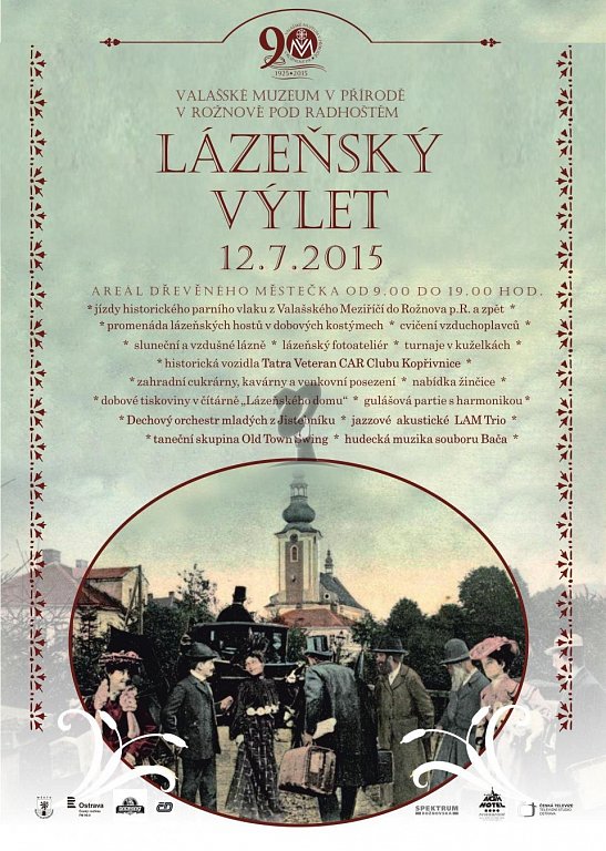 Lázeňský výlet 2015 je návrat do časů lázeňského Rožnova. Návštěvníci se budou moci vrátit do časů, kdy byl Rožnov vyhlášen lázeňským místem. Devátá hodina ranní otevře brány muzea a lázeňští hosté v dobových kostýmech zahájí svou ranní procházku na čerstvém vzduchu za zvuků hudby…