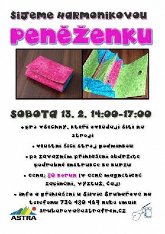Kurz šití je určen pro mírně pokročilé. Podmínkou je vlastní šicí stroj. Během 3 hodin si ušijeme peněženku typ harmonika. Počet míst je omezen.