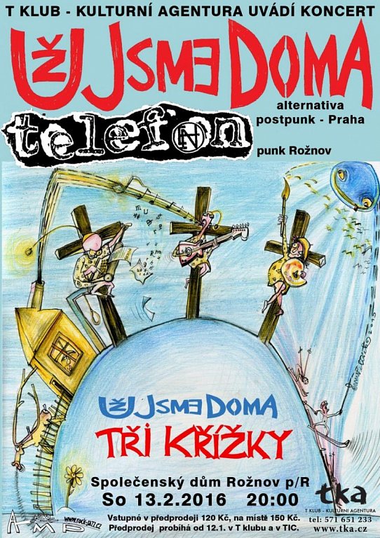 UŽ JSME DOMA, jedna z nejznámějších českých kapel v zahraničí a stálice české alternativní scény natočila ke svým třiceti letům předělávkové album Tři křížky retrospektující kariéru kapely. Starší skladby byly nahrány znovu a aby se ještě více podtrhla jejich aktualizace, byly jim změněny názvy. Povedlo se to náramně a se stejnojmenným programem objíždí česká a slovenská pódia. Jako první kapela vystoupí TELEFON, domácí punková stálice s několika alby na krku a pořádnou dávkou invence a vzdoru v rukávě.
