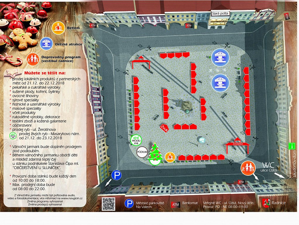Na ploše náměstí bude na pět desítek dřevěných stánků s pekařskými a cukrářskými výrobky, bylinkami, masnými produkty, ale také rukodělným zbožím, dekoracemi a koženou galanterií. „Stoly se jmelím, chvojím, vánočními kyticemi budou i pod podloubím,“ řekla Hana Rolná z návštěvnického centra. Od 21. do 23. prosince se budou prodávat i kapři.