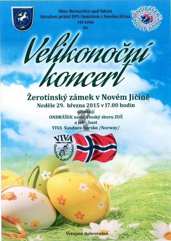 V neděli dne 29.3.2015 proběhne Velikonoční koncert v Žerotínském zámku od 17:00 hod., kde vystoupí pěvecký sbor Ondrášek spolu s hostem VIVA Sandnes z Norska.