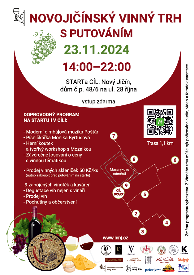 Již tuto sobotu 23. listopadu se Nový Jičín promění v ráj pro milovníky vína při 3. ročníku Vinného trhu, který letos přichází s novou dramaturgií. Výchozím bodem akce se stane dům na ulici 28. října 48/6, kde návštěvníci od 14:00 do 22:00 získají skleničku za symbolických 50 Kč, mapku a kartičku k účasti ve slosování, které proběhne ve 20:00.