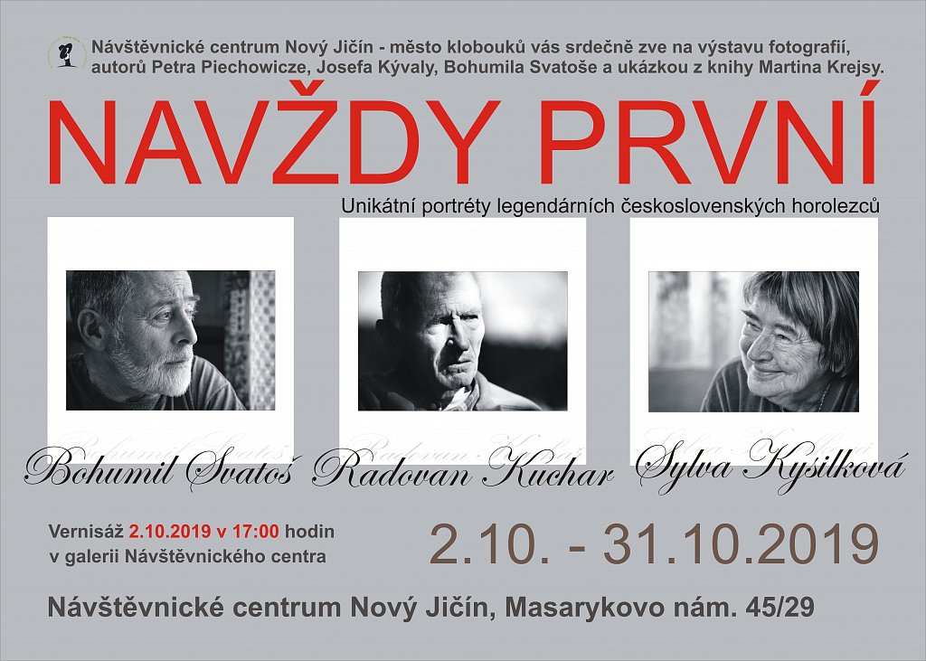 Středa 2. října 2019 - čtvrtek 31. října 2019 - galerie Návštěvnického centra – výstava fotografií / portréty legendárních československých horolezců / s názvem NAVŽDY PRVNÍ – autorů Petra Piechowicze, Josefa Kývaly, Bohumila Svatoše a Martina Krejsy.