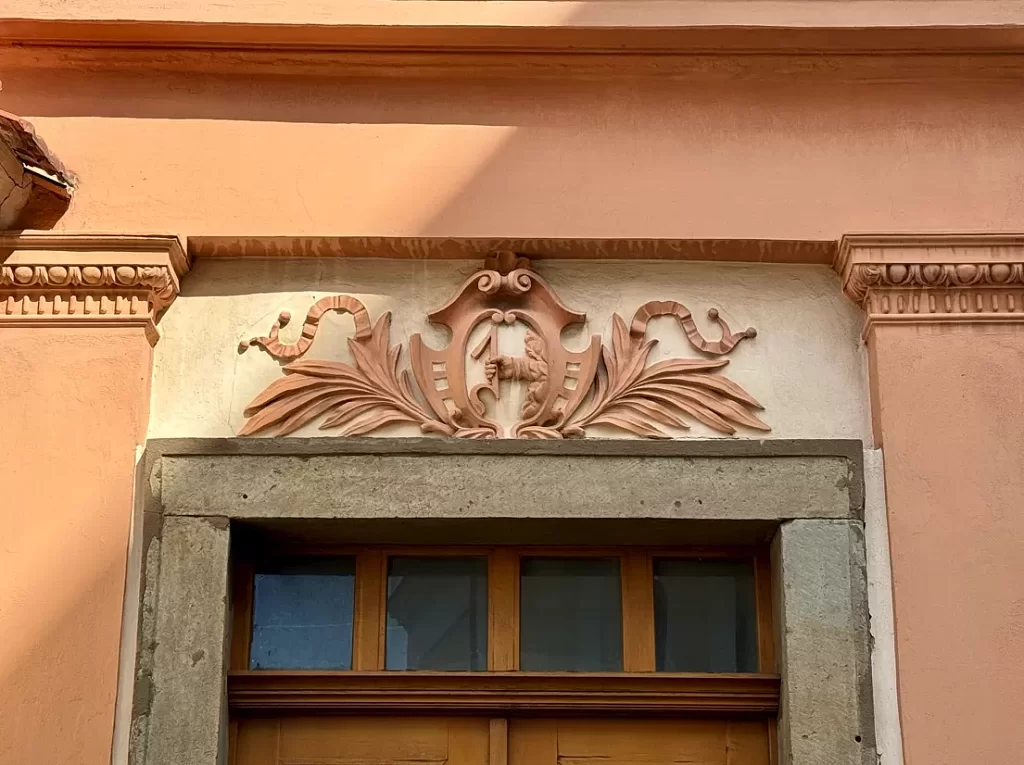 Stucco relief cartouche measuring 56 x 131 cm on the facade of the old school building.