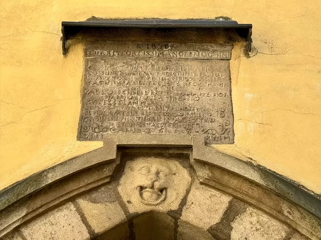 Płaskorzeźbiona tablica w łuku południowego portalu kościoła.