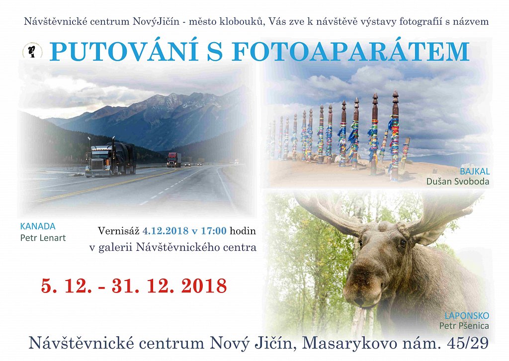 Návštěvnické centrum Nový Jičín - město klobouků si Vás dovoluje pozvat na výstavu fotografií s názvem PUTOVÁNÍ S FOTOAPARÁTEM (Kanada-Petr Lenart, Laponsko-Petr Pšenica, Bajkal-Dušan Svoboda), která bude k vidění v galerii návštěvnického centra do 31. prosince 2018.