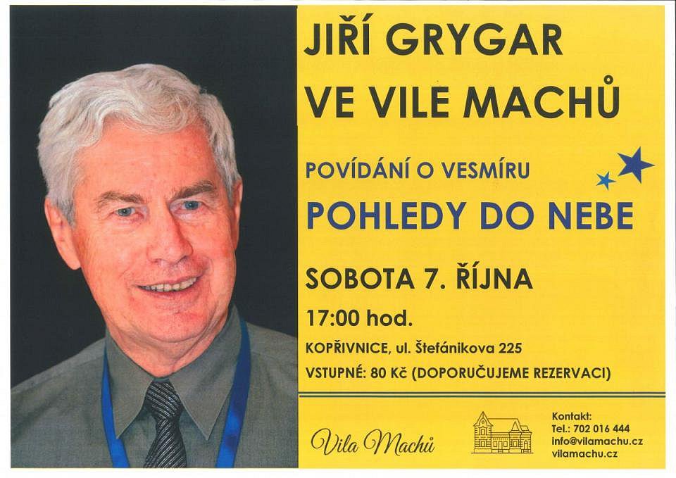 Povídání o vesmíru. RNDr. Jiří Grygar, CSc., astronom a astrofyzik působící na Centru částicové fyziky Fyzikálního ústavu Akademie věd ČR, známý popularizátor vědy, nositel nejednoho hodnotného vědeckého ocenění, navštíví vilu s přednáškou nazvanou Pohledy do nebe. Na přednášku se doporučuje udělat si předem rezervaci.