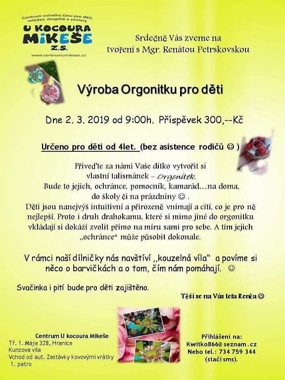 Výroba orgonitku pro děti se bude konat v sobotu 2. března od 9:00 hodin v Centru U Kocoura Mikeše. Tvoření je určeno pro všechny děti od 4 let bez asistence rodičů a dopolednem provede Mgr. Renáta Petrskovská. Pro děti bude připravena svačinka i pití. Nutná rezervace na telefonu 734 759 344 (stačí i sms) nebo emailu: Kwitko866@seznam.cz .