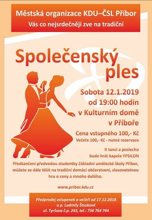 Tradiční ples Městské organizace KDU - ČSL Příbor. K tanci a poslechu hraje hudba Ypsilon, předtančení předvedou studentky Základní umělecké školy Příbor.
