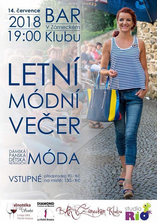 Letní módní přehlídka se bude konat od 19:00, těšit se můžete na přehlídku dámského, pánského, dětského i netradičního oblečení. Vstupenky v předprodeji si můžete zakoupit v Zámeckém klubu nebo Studiu Rio.
