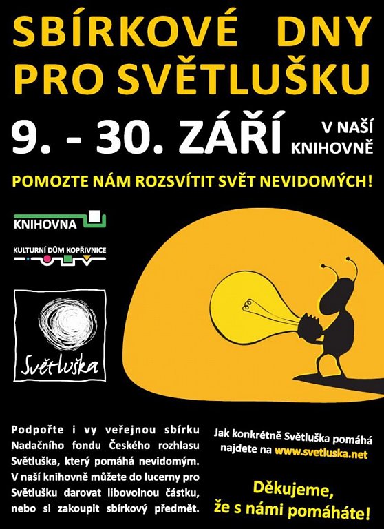 Podpořte i vy veřejnou sbírku Nadačního fondu Českého rozhlasu Světluška, který pomáhá nevidomým. V naší knihovně můžete do lucerny pro Světlušku darovat libovolnou částku, nebo si zakoupit sbírkový předmět. Otevřeno máme každé pondělí, úterý, čtvrtek a pátek v době 7:30 - 18:00 hodin. Jak konkrétně Světluška pomáhá, najdete na www.svetluska.net. Děkujeme, že s námi pomáháte!
