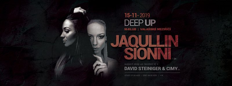 Další pokračování klubové akce DEEP UP se podruhé uskuteční v krásných prostorech M-klub Valmez ve Valašském Meziříčí. Těšit se můžete na aktuálně jednu z nejžádanějších djane v České republice - Jaqullin. Slovenskou krásu techna přijede zahrát djane Sionni. Tradičně celou akci odstartují a ukončí David Steiniger a DJ Cimy.