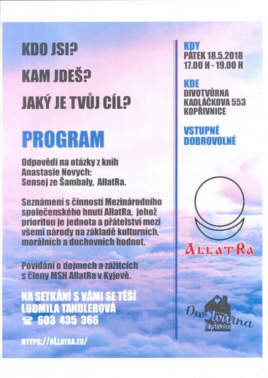 Seznámení s činností Mezinárodního společenského hnutí AllatRa, jehož prioritou je jednota a přátelství mezi všemi národy na základě kulturních, morálních a duchovních hodnot.