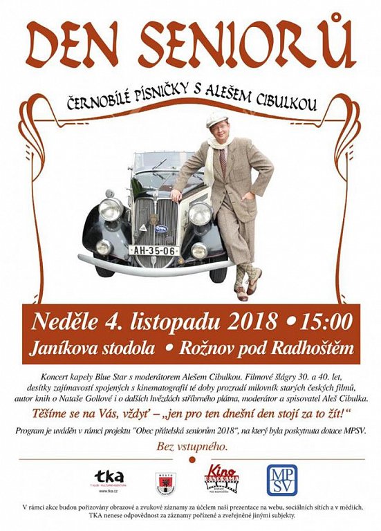Rožnov pod Radhoštěm 4. 11. 2018 v 15:00 DEN SENIORŮ – ČERNOBÍLÉ PÍSNIČKY S ALEŠEM CIBULKOU
